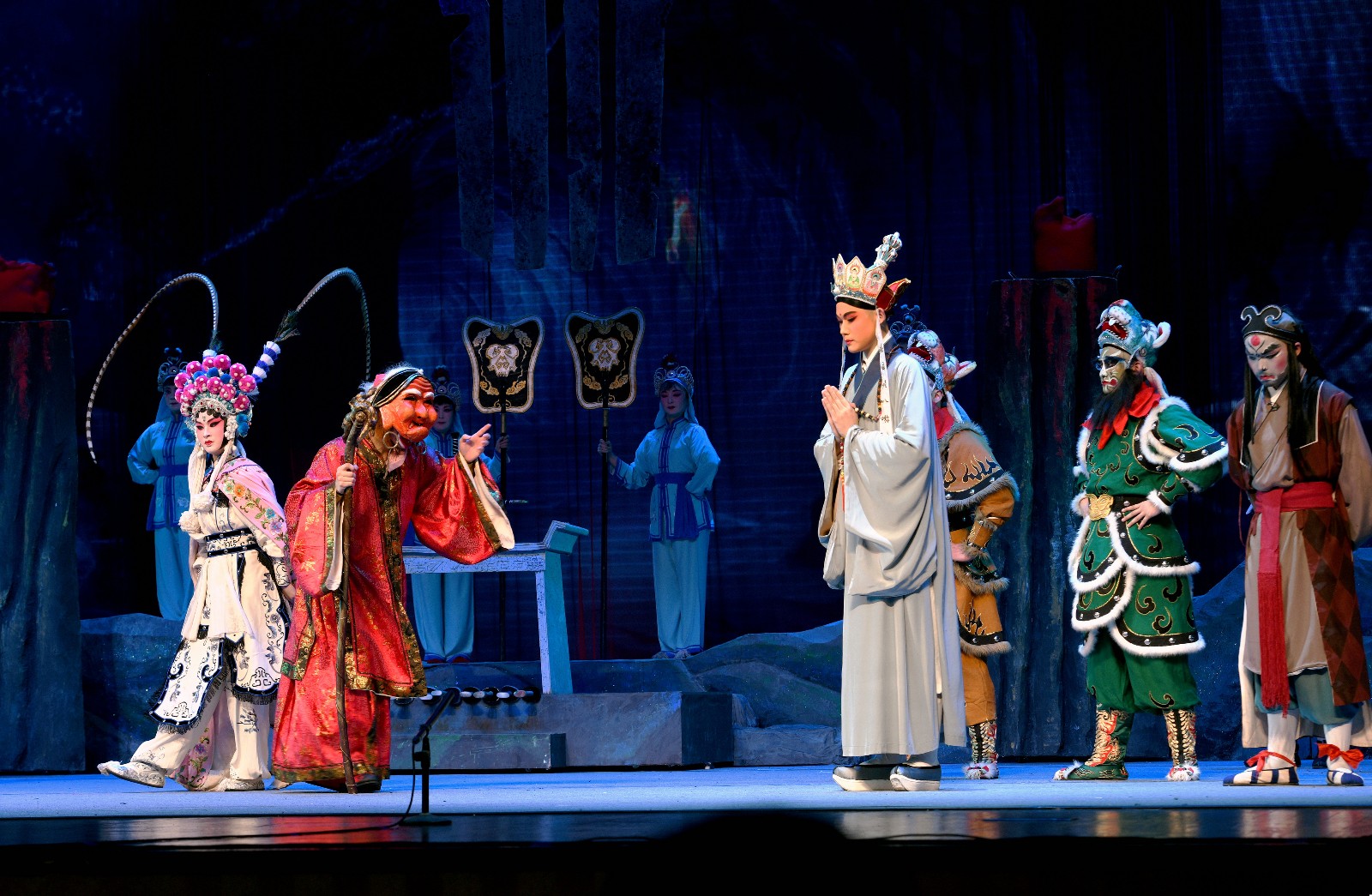 首先亮相的是传统经典绍剧《孙悟空三打白骨精》,该剧是绍剧表演艺术家六龄童先生的代表剧目,在1960年拍摄成电影发行至72个国家和地区,在世界上产生了广泛影响。整整一个甲子后,传承经典的接力棒落在14绍剧班同学们的身上,其意义不言而喻。青春版《孙悟空三打白骨精》由一级演员、六龄童先生的弟子郭骏执导,浙艺和萧山绍剧艺术中心的老师们执教。演出当晚,六小龄童专程发来贺信,给予学生鼓舞和勉励。