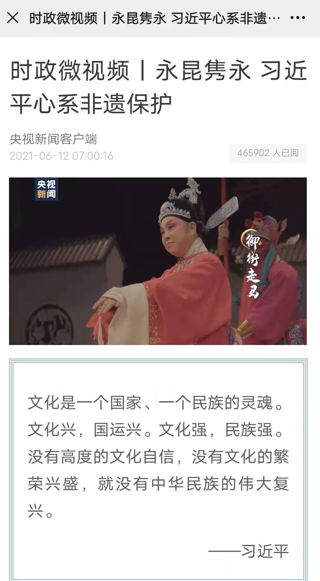 文化是一个国家、一个民族的灵魂。文化兴,国运兴。文化强,民族强。没有高度的文化自信,没有文化的繁荣兴盛,就没有中华民族的伟大复兴。