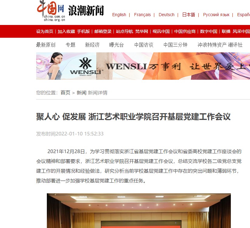 2021年12月28日,为学习贯彻落实浙江省基层党建工作会议和省委高校党建工作座谈会的会议精神和部署要求,浙江艺术职业学院召开基层党建工作会议,总结交流学校各二级党总支党建工作的开展情况和经验做法,研究分析当前学校基层党建工作中存在的突出问题和薄弱环节,推动部署进一步加强学校基层党建工作的重点任务。
