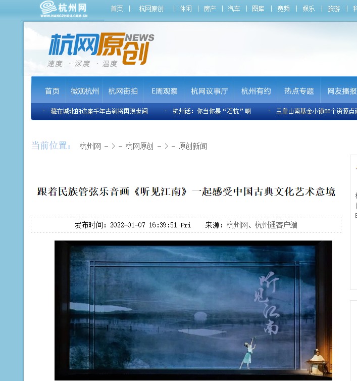 1月6日晚,大型民族管弦乐音画《听见江南》在浙江实验艺术剧场诗意演绎。这是浙江省舞台艺术“1111”人才计划成果展示的重要作品、2020年浙江文化艺术发展基金资助项目、2021-2022年浙江省舞台艺术创作重点题材扶持项目,也是2022省属院团新年演出季线下第一场演出。