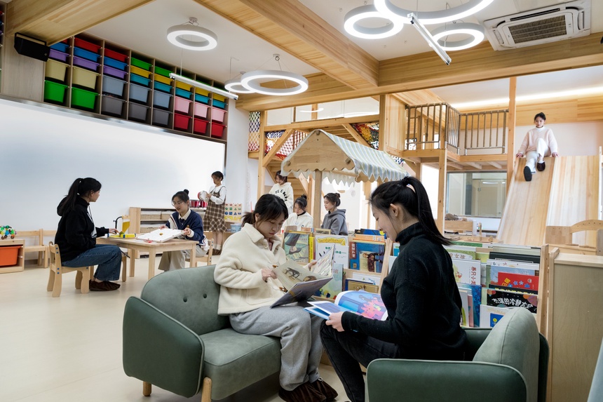 据了解,浙江艺术职业学院建有模拟幼儿园实训室和远程交互智慧实训室。实训室模拟幼儿园空间,设计了角色扮演区、盥洗室、美术区、益智区、绘本区、游戏区等区域,配有四百多册绘本及幼儿园玩教具,让学生在校学习期间就能感受到幼儿园的工作环境。远程交互智慧教室实训室,除了常规的理论教学,可以与合作幼儿园线上互动,实时观看幼儿园的工作流程,比如保育员怎么配餐,孩子吃完后如何收回餐具等,还可以线上提问,及时解决学习上的困惑。