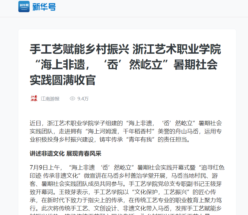 新华网:手工艺赋能乡村振兴 浙江艺术职业学院“海上非遗,‘岙’然屹立”暑期社会实践圆满收官