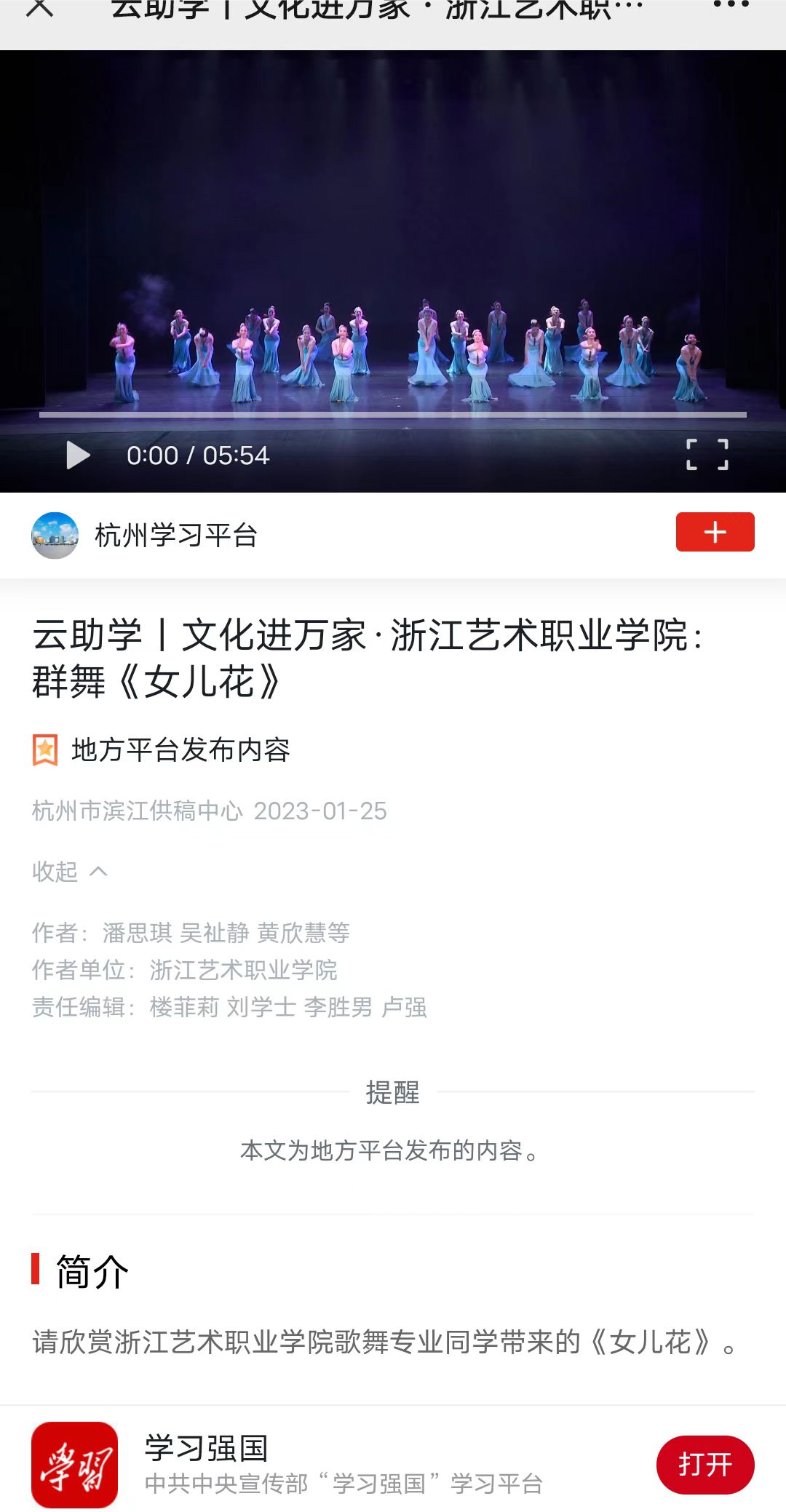 学习强国杭州平台:云助学丨文化进万家·浙江艺术职业学院:群舞《女儿花》
