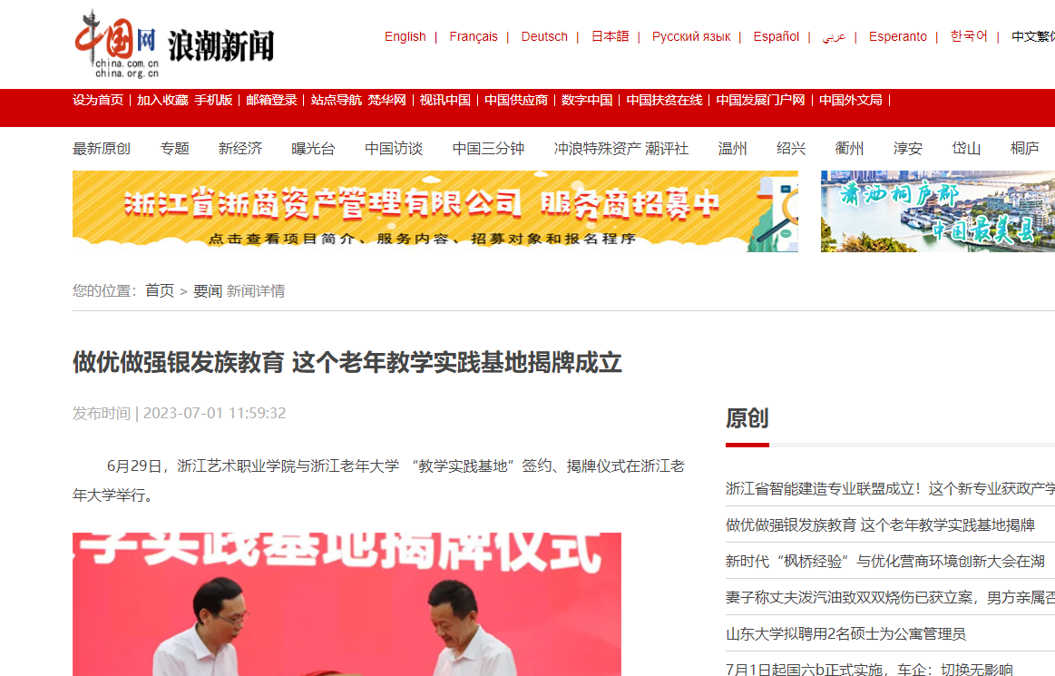 6月29日,浙江艺术职业学院与浙江老年大学 “教学实践基地”签约、揭牌仪式在浙江老年大学举行。