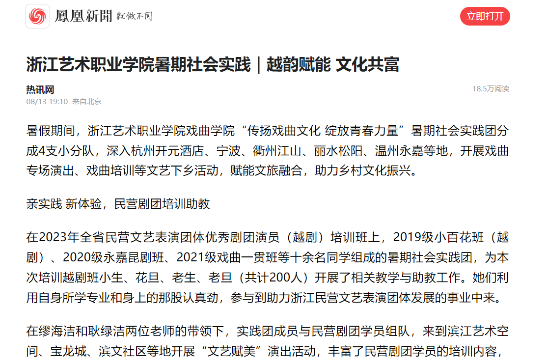 暑假期间,浙江艺术职业学院戏曲学院“传扬戏曲文化 绽放青春力量”暑期社会实践团分成4支小分队,深入杭州开元酒店、宁波、衢州江山、丽水松阳、温州永嘉等地,开展戏曲专场演出、戏曲培训等文艺下乡活动,赋能文旅融合,助力乡村文化振兴。