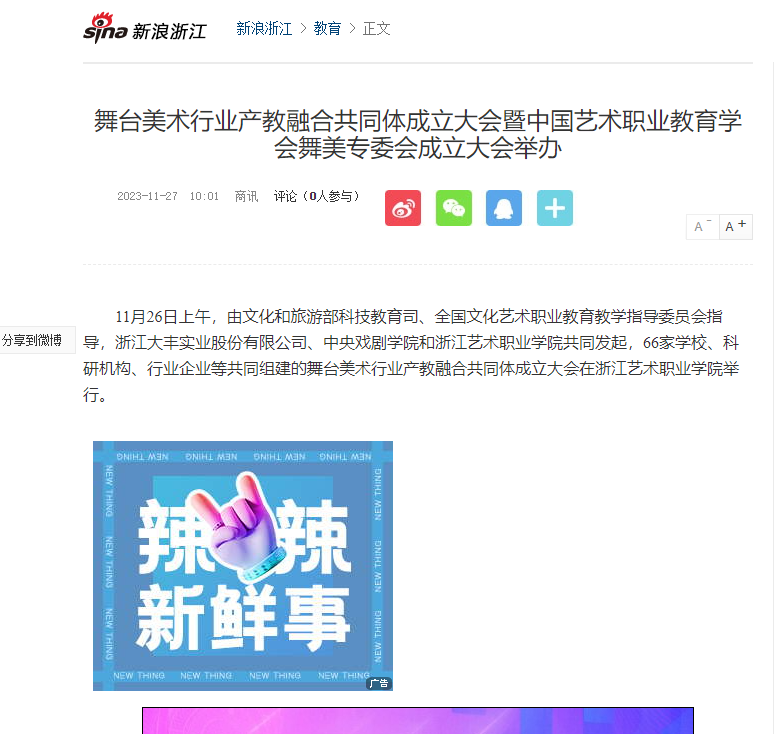 11月26日上午,由文化和旅游部科技教育司、全国文化艺术职业教育教学指导委员会指导,浙江大丰实业股份有限公司、中央戏剧学院和浙江艺术职业学院共同发起,66家学校、科研机构、行业企业等共同组建的舞台美术行业产教融合共同体成立大会在浙江艺术职业学院举行。