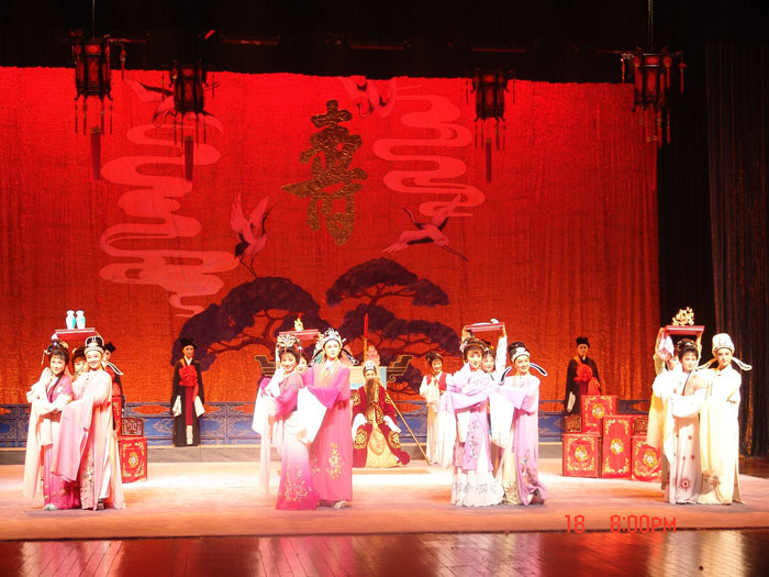 越剧传统精品剧目《碧玉簪》和《五女拜寿》是附中戏剧科的常规教学剧目,也是2003级越剧班在本学期的重点教学剧目。其中,《五女拜寿》由学院戏剧系教师史昕执导,该剧人物角色丰富、感情深刻,十分适合训练学生的综合能力和提升他们的表演技巧。由于教学时间紧、任务重,唱腔老师、身段老师和剧目老师都放弃了午休和双休时间,全力投入到排练中。何雪倩同学从排练开始,就一直负责该剧的伴奏音乐,为确保配乐的准确与完整,她多次与实践部联系,反复进行修改,任劳任怨。庄筠晓、戴维同学作为该剧的舞台监督,走到哪儿都随身携带着一本笔记,将导演的要求及时记录下来。在三个多月排练时间里,师生们全力以赴,分工明确,从而确保了《五女拜寿》的演出成功。