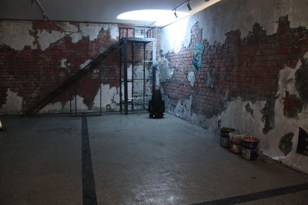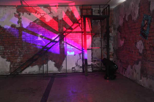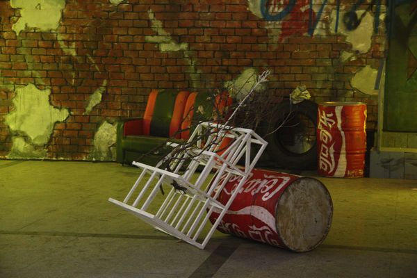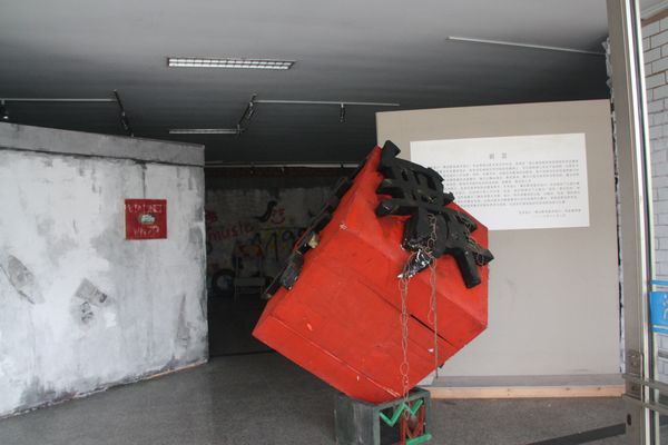 这次毕业展览依托4号楼大厅为空间,创造出一个复古中透着七八十年代叛逆朋克气息的世界。离四号楼正门50米开外的地方,老远就能望见一个火红的立方体,上面刻有四个黑色木雕大字——舞美出品。展区入口呈凹形,犹如哆啦A梦的时光隧道,带你进入一个现实穿越梦幻的舞台。这不是好莱坞大片现场,也不是街舞社团,更不是3D鬼屋,但这里的每一个细节无不体现出奇幻与现实的巧妙结合。场景内部设有3个彩色散光灯,颜色依次是:红、蓝、黄、橙、紫、白。红色给人一种火焰燃烧之感,绿色则透着一种温暖奇幻之感,而白色又带来回归现实的感觉。墙上布满了涂鸦,还有左测废弃的轮胎,旧沙发,可口可乐的汽油桶。楼梯和门的设计也成为展出的一道风景线,往右边走去你会看见一个类似于观望台一样的梯子,当灯光匀速转动并更换时,会在墙上形成不同的投影。