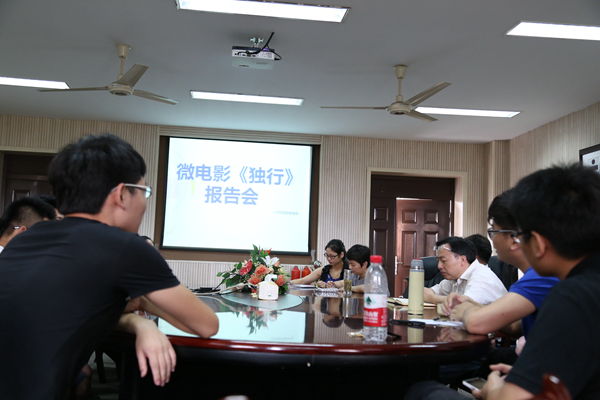 首映结束后,电影主创人员和教师在学院4号楼会议室进行了汇报会。会上,主创人员为大家讲解了《独行》影片从分工到后期制作的全过程,谈了自己从拍摄影片中得到的收获与经验。影视技术系党支部书记彭云波、郑怡文老师等对微电影《独行》作了高度评价。