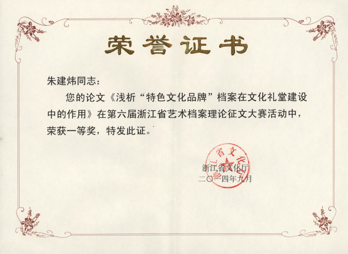 为推进全省文化艺术档案建设,提高艺术档案的理论研究水平,浙江省文化厅开展第六届浙江省艺术档案理论证文活动,共收到论文144篇,评出一等奖12篇、二等奖20篇、三等奖38篇和优秀组织奖一名。浙江艺术职业学院综合档案室朱建炜撰写的《浅析“特色文化品牌”档案在文化礼堂建设中的作用》论文在众多作品中脱颖而出,荣获一等奖。