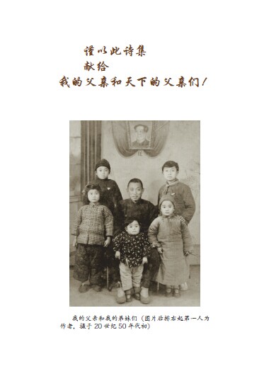 诗集不仅有诗有文有注,还有书画摄影,有书坛泰斗沙孟海题赠作者的“水清则智”书法、美术家肖峰题赠作者的“个中有画”书法以及作者的绘画、书法和摄影作品。最令人动容的是,诗集首页刊有一张上世纪50年代的老照片,一位父亲和5位小孩的合影,作者是照片中的长子。照片的上端赫然写着:“谨以此诗集献给我的父亲和天下的父亲们!”并在后记中“注释”道:这本诗集“也是一位父亲有意无意间给孩子购买了一本有关于思想、人格、品位的课外读物的故事……”