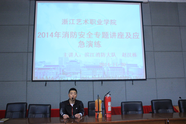 11月20日中午,浙艺院消防安全知识讲座在图信中心举行。讲座特邀滨江消防大队赵汉栋参谋主讲全体学生会成员及保卫处、后勤发展公司人员听取讲座。