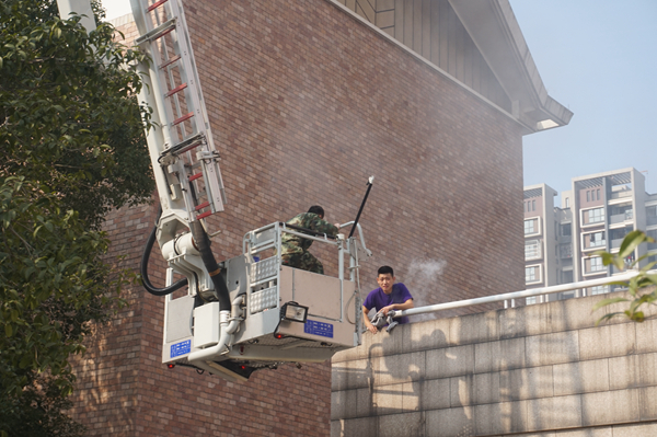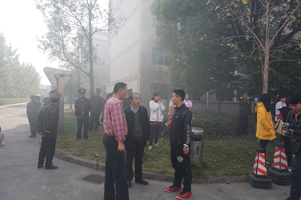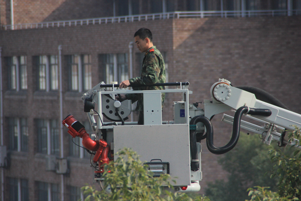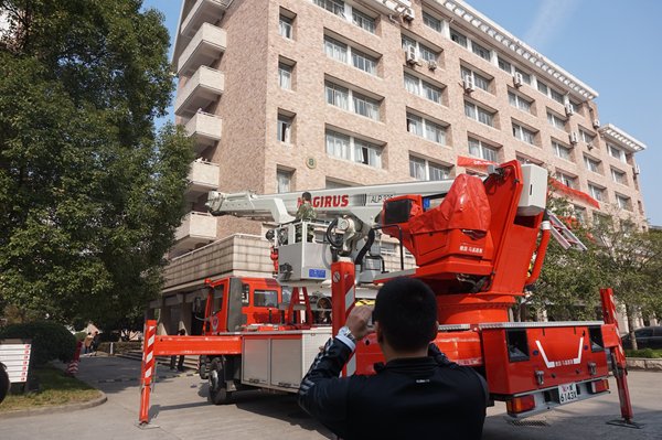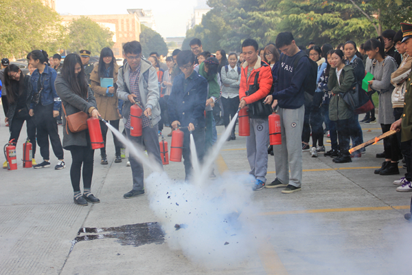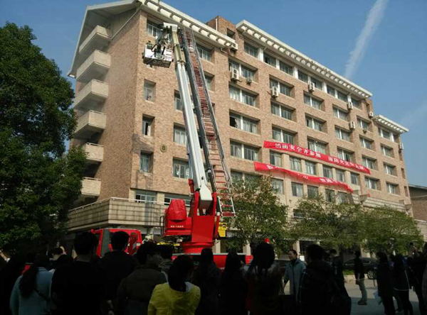 讲座之后,在八号楼前广场举行了现场演练。在消防及保安人员的指导下,同学们参与其中,亲身体会了一把用灭火器浇灭保卫处制造的小型火盆,过了一把消防瘾。更值得一提的是消防车现场高空救人的演练。由戏剧系学生管兴东扮演的被困者在8号楼5楼呼喊救命,来自滨江消防中队的消防战士有条不紊地操作着消防登高梯,迅速抵达被困人员的位置,顺利救下被困人员。