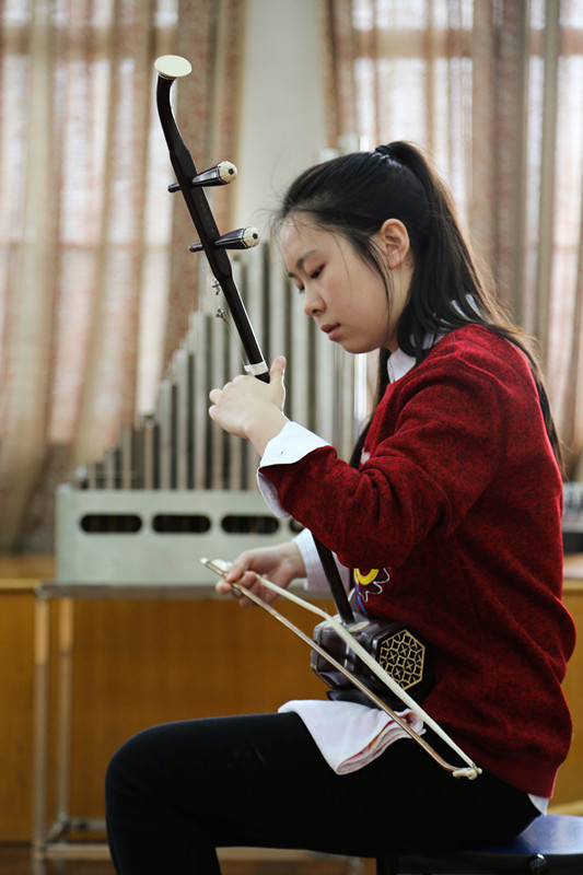 音乐考场内,这位穿着红色衣服的姑娘完全沉浸在音乐的世界里,忘我的拉着二胡。这里不是考场,是表演的舞台,考官们就是她的听众。在视唱练耳教室里,还有一位姑娘正认真地听琴识谱呢,敏感的音乐素养,让这个考试变得小菜一碟。