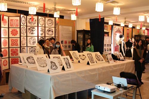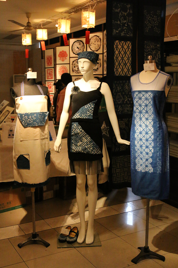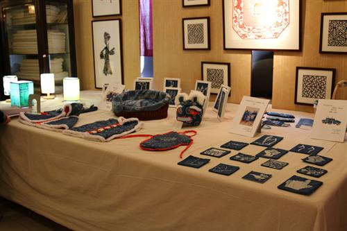 展览现场可以看到精美细致、风格特异的剪纸作品和用灯薰法制作的剪纸样板,蓝印花布铺设在展区的各个角落,工艺用具陈列在展区正中,各色剪纸、印花布将展区装点得新颖又别致,每个角落都充满着同学们对母校的爱。展出的另一项目是扎染,同学们经过模板印花、刷桐油、铺浆料、反复浸染、刮石灰等一系列复杂过程,再加上独特创意,制作出各式各样的复古扎染艺术品,蓝印画布以布袋,纸灯,抱枕、衣服等多种形式呈现在眼前。