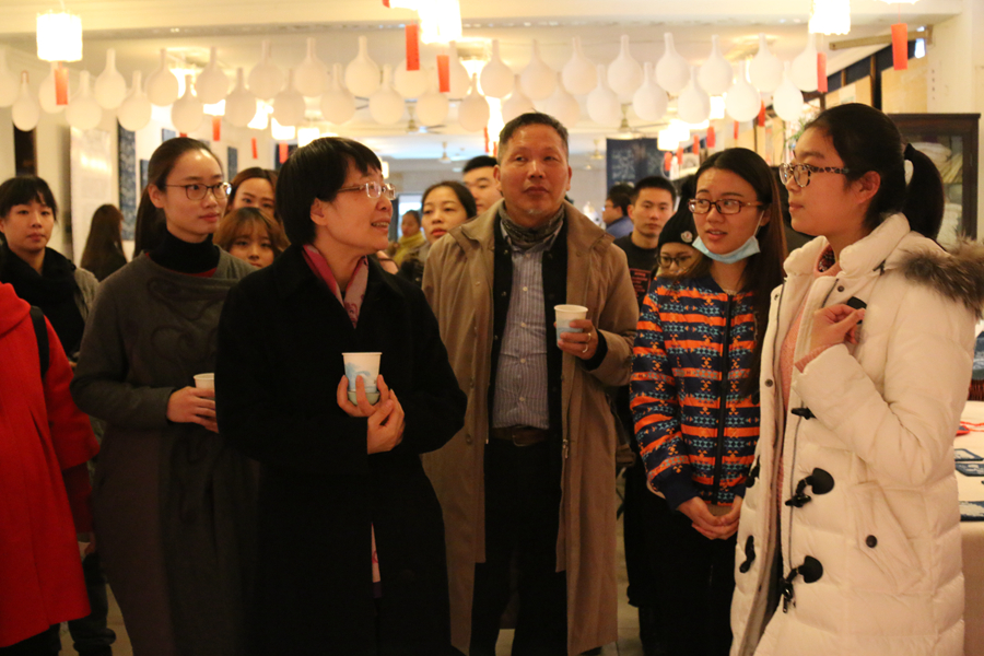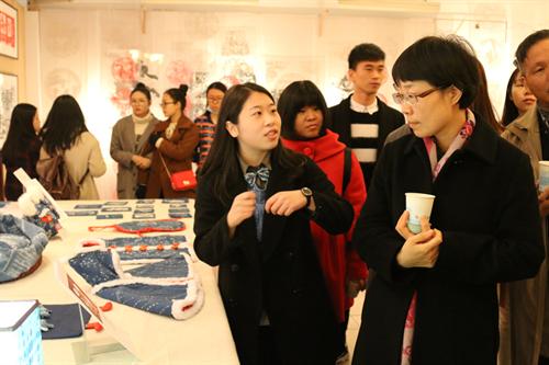 12月21日,文管系13非遗班在八号楼8204教室举办为期4天的毕业作品展。院党委书记、副院长朱海闵,副院长沈恒前往现场观看展出。