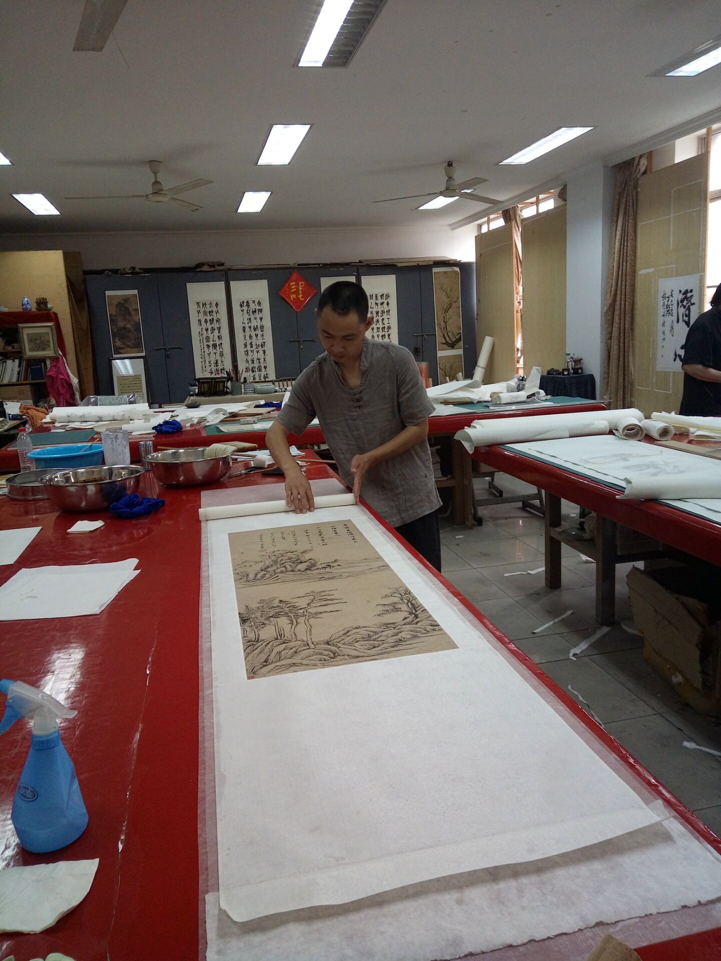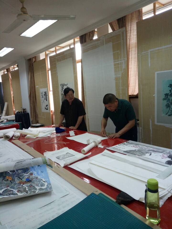 倪柏钦是萧山的非遗传承人,从当学徒那会儿算起,从事书画装裱行业快20年了。做起装裱来,动作可麻利了,喷水、刷浆糊……一下子就搞定。他说:“裱画的过程就是和古人交流的过程,要把它当做一件艺术品去做。来培训后,我对装裱的思路大不一样,信心也有了提升,更有干劲去坚持这项事业了。”