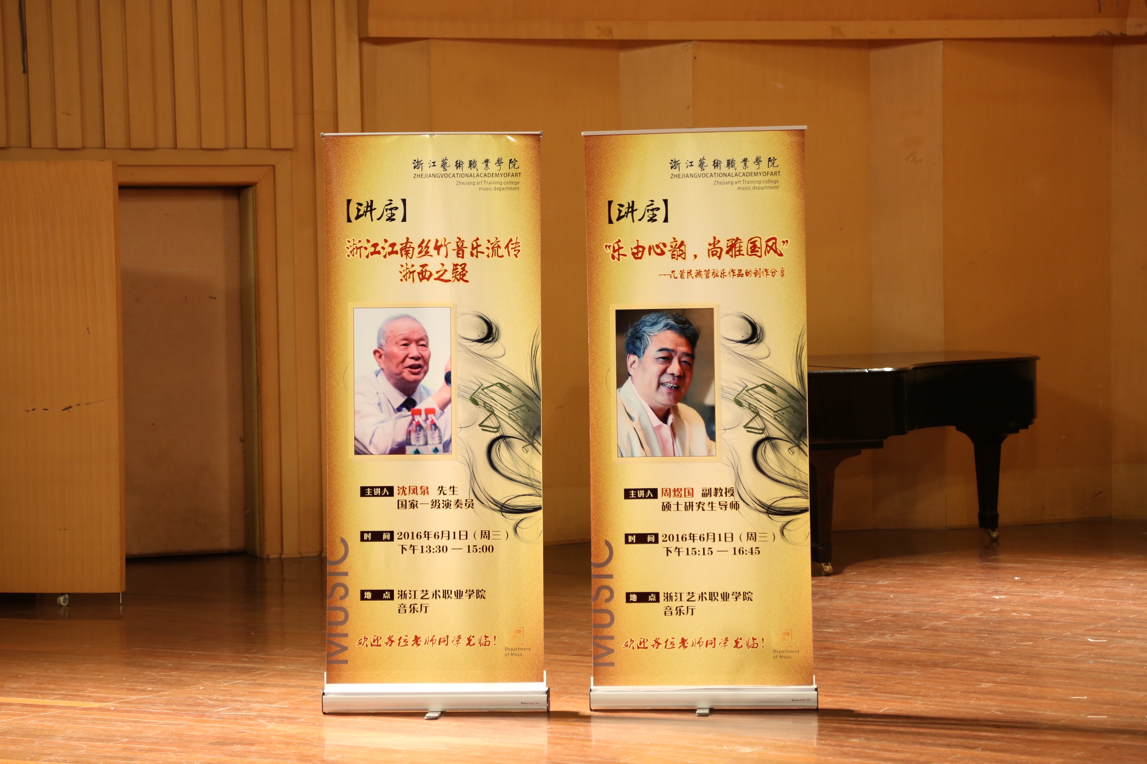 6月1日下午,浙江省音乐家协会二胡专业委员会会长、浙江省民族管弦乐学会副会长、国家一级演奏员沈凤泉和作曲家、指挥家、西安音乐学院副教授周煜国应浙江艺术职业学院音乐系民族器乐教研室邀请,在音乐厅分别举办了题为《浙江江南丝竹音乐流传浙西之疑》《“乐由心韵,尚雅国风”——几首民族管弦乐作品的创作分享》两场学术讲座,吸引了众多生前来观摩。