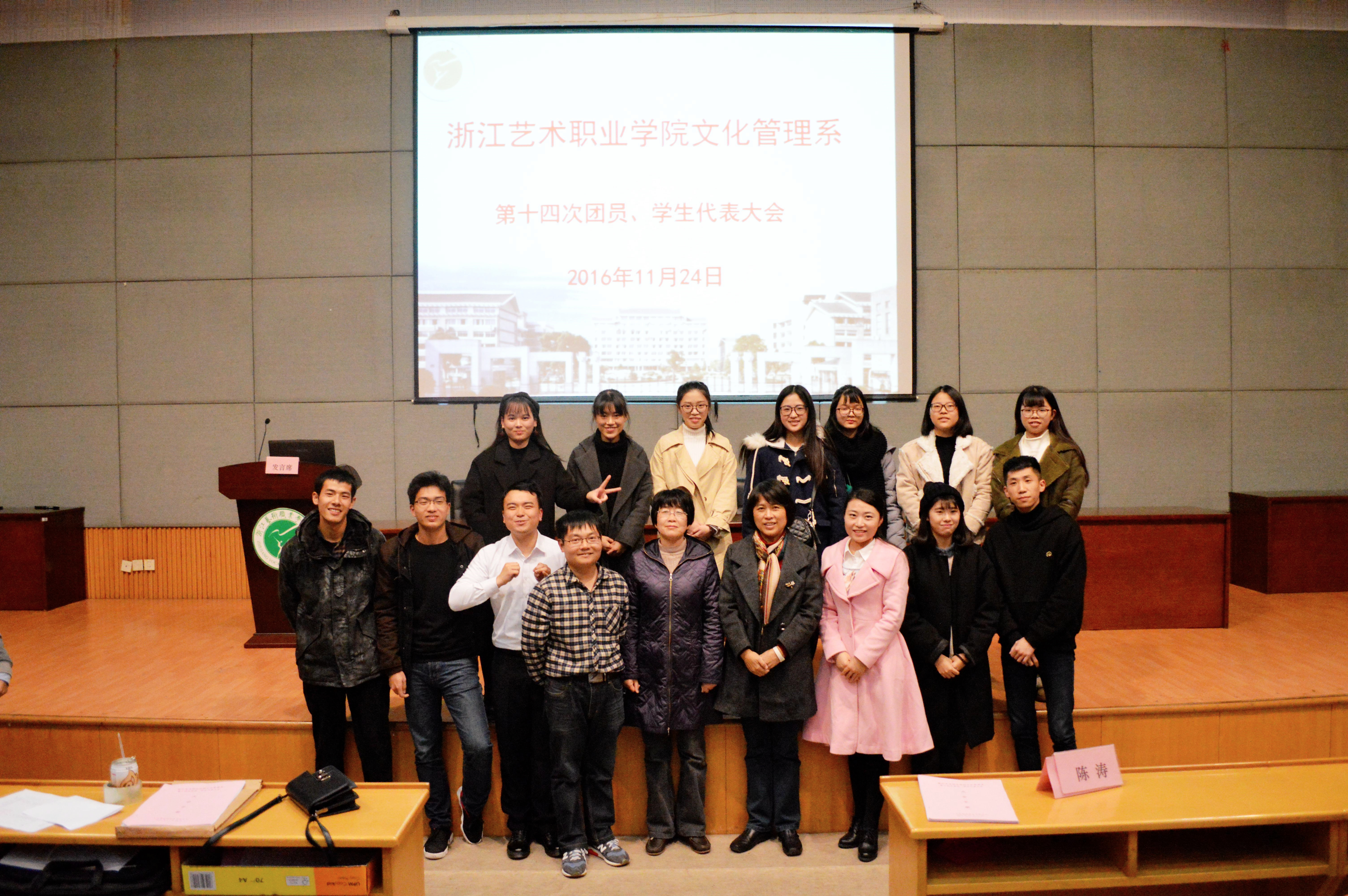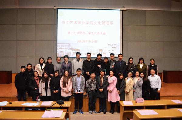 11月24日晚,浙江艺术职业学院文化管理系第十四次团员、学生代表大会在图信中心报告厅举行。院党委学工部副部长、学生处副处长(主持工作)陈毅、院团委副书记郑吟及文管系师生代表等出席本次会议。