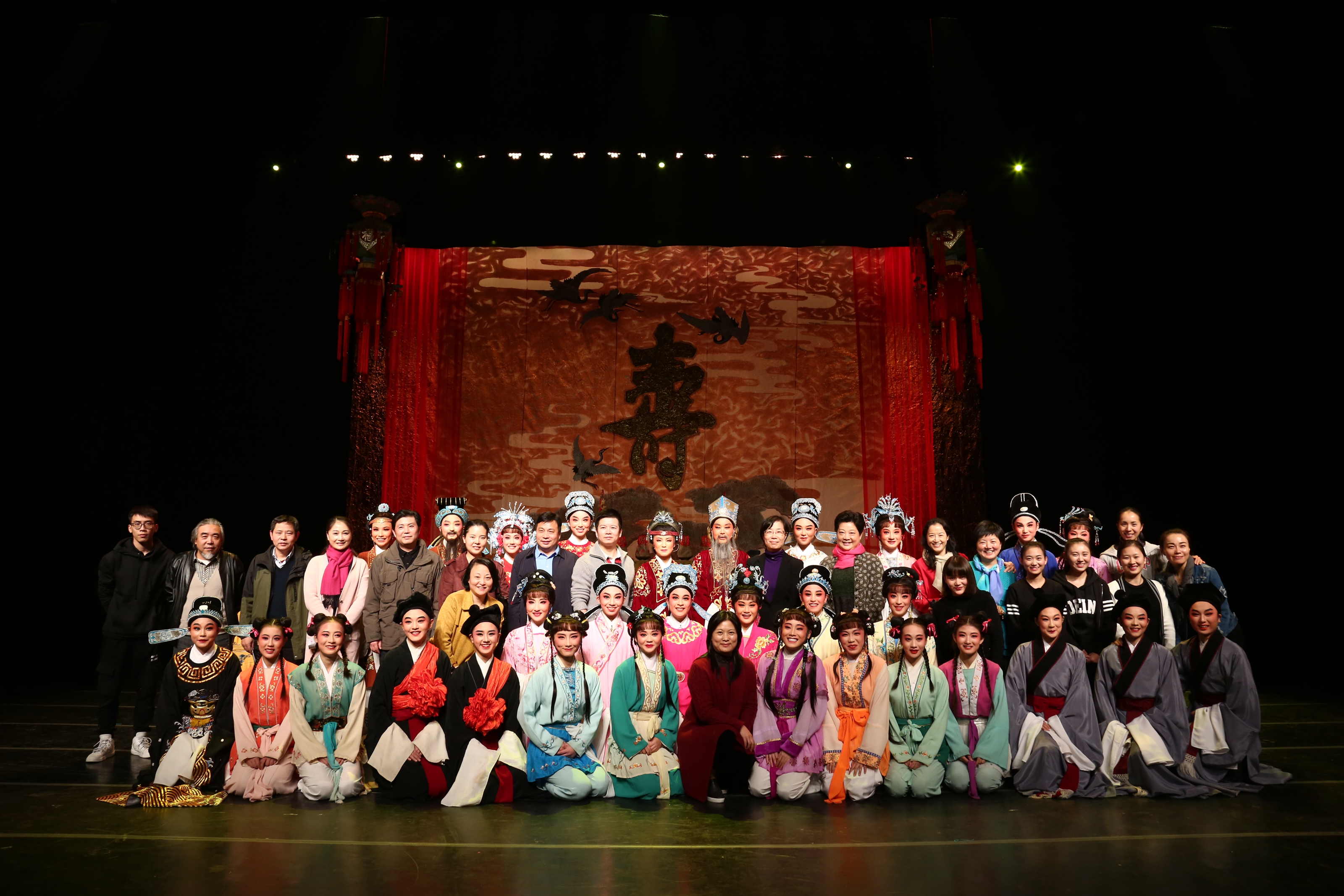 在戏的开头,舞台大幕一拉开,花团锦簇的小生、花旦就在“喜满华堂寿烛红”的喜庆中登台。台上人物个性鲜明,如大女婿、二女婿,一个学而无德,一个富而无品,学生表演得很是生动,现场剧团的老师们夸赞说:真是后生可畏。