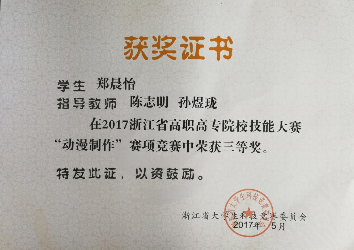 近日,由浙江省教育厅主办的2017年浙江省高职高专院校技能大赛“动漫制作”赛项竞赛在浙江纺织服装职业技术学院落下帷幕。浙江艺术职业学院美术系动漫设计专业学生刘家鑫、郑晨怡同学分获三等奖,黄月娇同学获优秀奖。