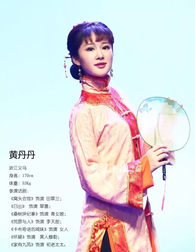 黄丹丹,浙江艺术职业学院戏剧系2015级影视表演专业学生。在浙艺就读期间,曾先后获得2016——2017浙江省政府奖学金、2017年度国家奖学金、2017全国大学生艺术节二等奖等荣誉奖项,扮演过《茶人杭天醉》“沈绿爱”、“林藕初”等角色,被老师和同学称为“戏里戏外不一样的女子”。