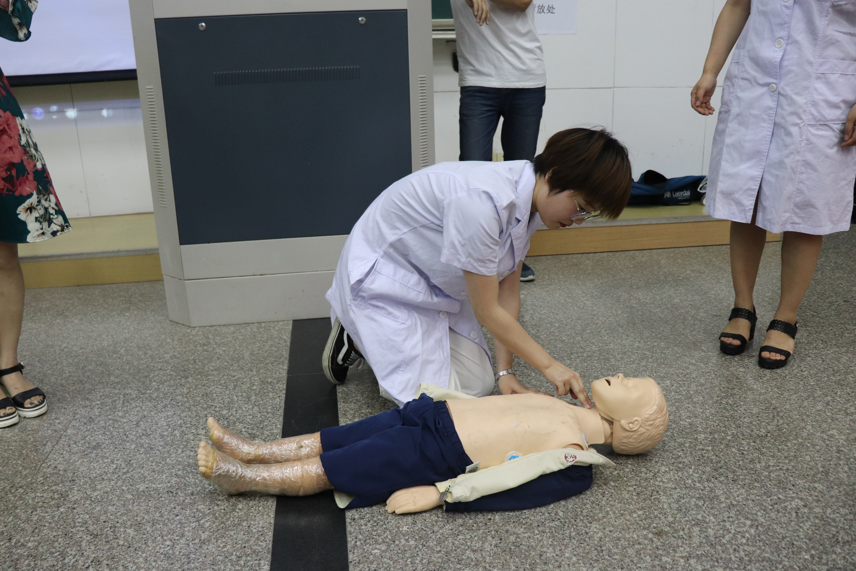 陈超以发生在校园内的一个个真实案例为切入点,介绍了遇到咽部受伤、咬(蛰)伤、惊厥,中暑、烧烫伤等突发情况时的急救方式,重点介绍了如何有效实施“心肺复苏”。陈超说,心搏骤停一旦发生,若得不到及时抢救复苏,4到6分钟后便会造成患者大脑和其他重要器官组织的不可逆损害,因而,心搏骤停后的心肺复苏必须在现场立即进行。现场,三位杭州儿童医院急诊科护士详细讲解并示范了心肺复苏的方法,同学们踊跃上场尝试,三位护士手把手地进行指导,矫正他们的错误姿势。