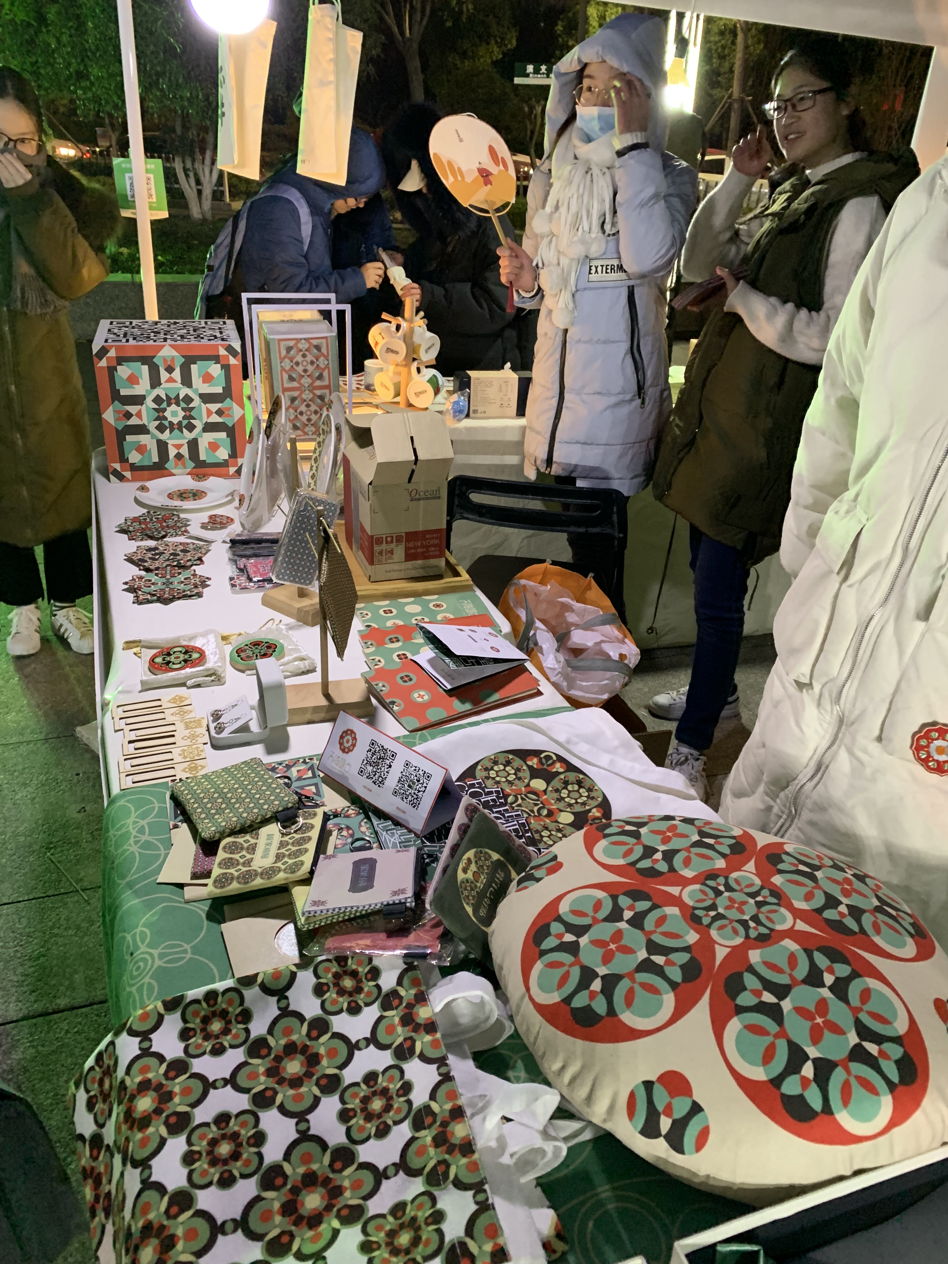 走进红色的“彩虹门”,便能看见那摆放在摊位旁的“小胖子”。这一处是广告创意产品,主题是“变形记”,展卖的有红色小胖子形象的贴纸、文件袋、健身日记、水杯等,创作者们介绍,这个设计是想要大家树立科学减肥,科学健身的理念。现场还能参与中奖机率较高的抽奖活动。“天绮咏古” “覆海”两组产品的灵感来源于敦煌壁画,设计者们希望年轻人能更多地喜欢中华传统文化,产品有抱枕、帆布包、红包等等。带着水果图案的手机壳、钥匙扣、眼罩、闹钟、水杯等“弄器”系列创意产品,旨在将健康知识传递下去,呼吁大家珍爱生命,养护器官,从年轻开始。“良渚玉器”摊位展卖的小首饰、手机壳、丝巾、抱枕等各类小产品精致美观,也有不少人购买。动漫设计的主要产品衍生于一部动画,有饰品、卡通人物、小场景、手提包、小布袋、动漫人物等。环境设计摊位是大家亲手织的围巾、帽子,编织的手提包、手环,样式精美,别出心裁。天气有些冷,可既是创作者又是零售商的同学们热情不减,向来往的人们推介着自己的产品。入了夜,创艺市集点亮了灯,有满载而归的买家,有热情似火的卖家,热热闹闹。学校领导、老师们也纷纷到市集里“淘宝”,支持同学们。