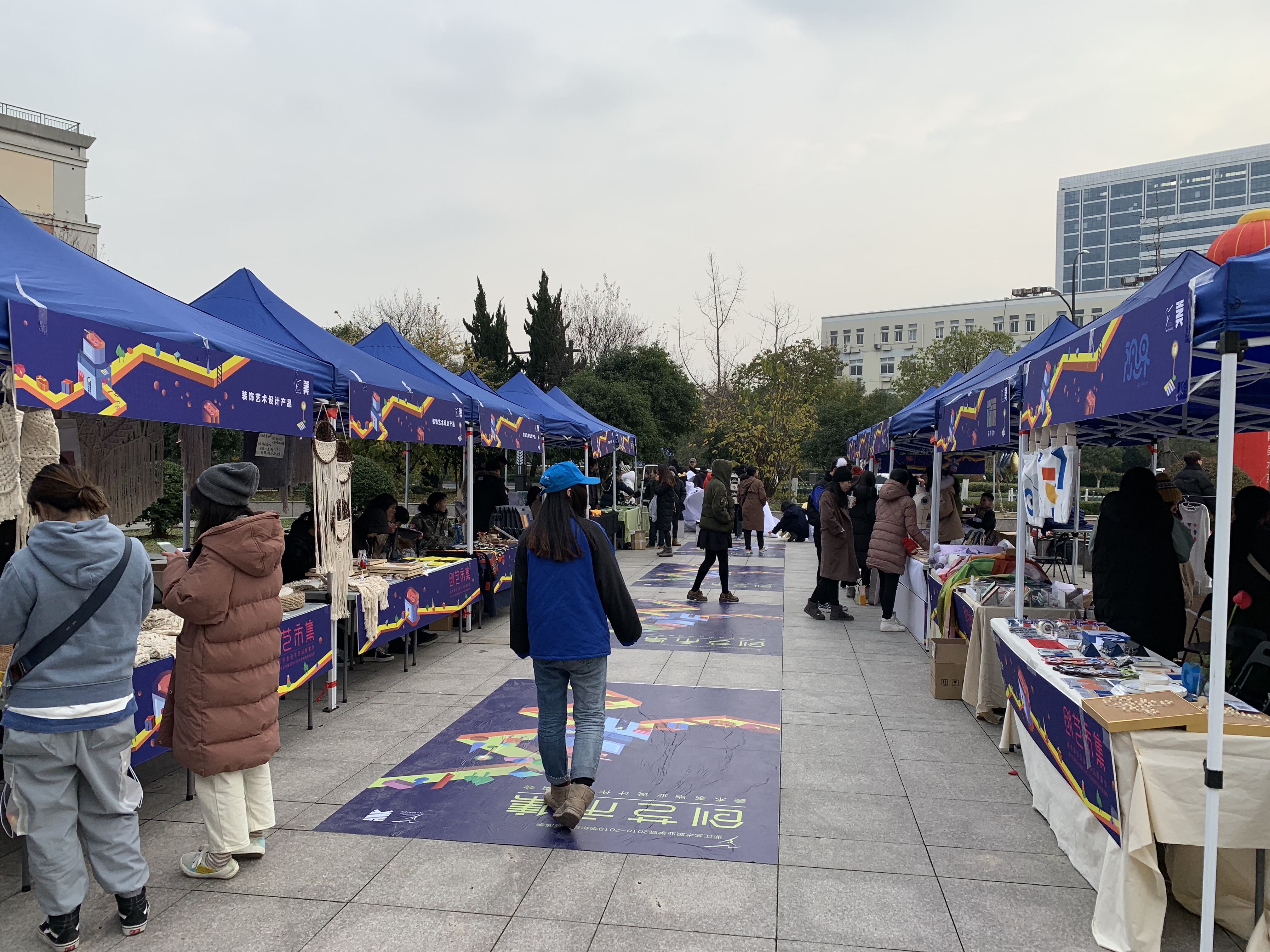 2018年的最后两天,浙江艺术职业学院学生创业园门口(实验艺术剧场前广场)横空出现了一个市集,广告创意产品、动漫衍生产品、装饰艺术作品、服饰品定制等琳琅满目,吸引了来往行人驻足欣赏、采购。大大的彩虹气球上写着“创艺市集”,这正是今年浙艺美术系2019届毕业作品展之后的二次创意——将面向市场实际需求的原创作品直接推向市场,让同学们更深刻地体会作品到产品的转化。