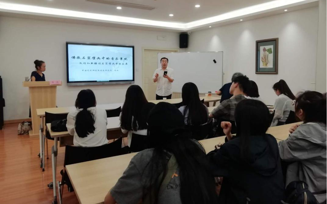讲座伊始,李玫研究员从“文化诗学”与“艺术图像学”的视野出发,提出对于艺术作品要进行两种阅读:品质阅读与价值阅读,通过作品的语言来寻找意义。通过敦煌石窟和新疆克孜尔石窟壁画中的音乐元素,来说明古人如何用造型艺术语言来表达音乐方面的内容,并提出艺术语言的表达意义方面形成了相对具体的艺术媒介语言的技巧和规律。佛教石窟壁画的沧海桑田,足以显见音乐在当时、当地、以及佛教发展过程中的重要作用。这些乐舞壁画为我们研究中西音乐文化交流、佛教音乐的东传提供了重要的实物资料,具有不可替代的学术价值。