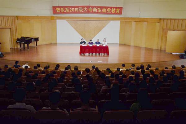 9月8日下午、9月9日上午,音乐系在学校音乐厅举行2019级高职新生始业教育。期间,组织系领导班子、全体辅导员、班主任与新生见面会,进行部分专业课程建设的讲解,解读学校《学生手册》中相关内容,明确军训期间的教育管理制度。系领导班子成员、全体辅导员、2019级高职新生及班主任参加会议,系党总支专职副书记、系组织员分别主持会议。