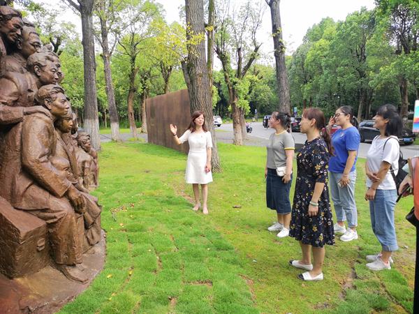 直属党支部书记刘秀峰同志带领教师们来到巨匠广场,向大家讲述蔡元培、林风眠和潘天寿等人的雕塑和《烽火艺程》大型纪念浮雕的纪念意义,讲述了杭州艺专师生(中国美术学院前身)在抗战中坚持办学、矢志不渝,壮怀激烈的烽火艺程。全体成员还参观了美院民艺馆的《生根·迭代——浙江高校非遗研培的实践》展览,刘秀峰给同志们深入浅出的讲解了中华优秀传统文化的精神内涵以及非物质文化遗产对传承优秀传统文化的重要性。她强调在新的历史条件下,把传统技艺与现代生活相结合是非遗传承必须克服的难题,而创新优秀传统文化、实现传统文化的创造性转化需要相信新一代的年轻人,相信青年人的眼光。