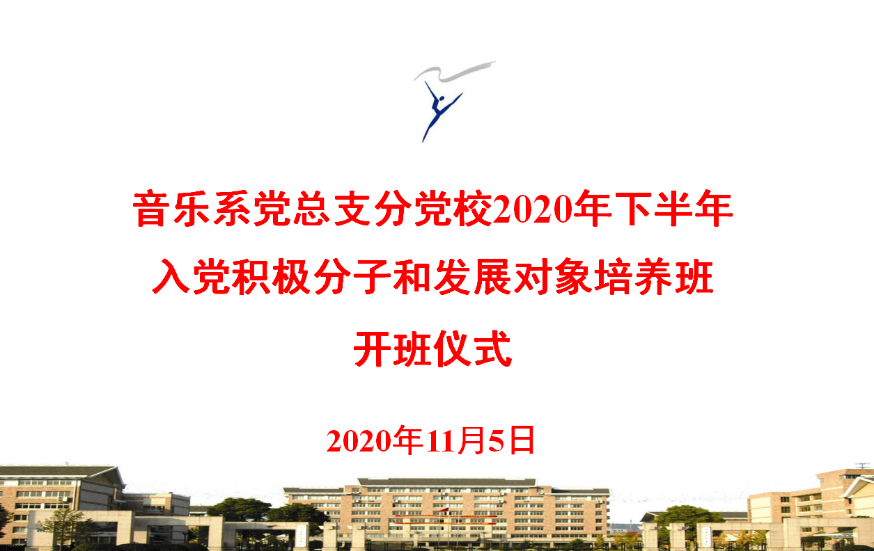 11月5日,音乐系党总支分党校在图信中心报告厅举行2020年下半年入党积极分子和发展对象培养班开班仪式。学校党校校务委员、党校教研部主任、社会科学部副主任胡卓群,音乐系党总支常务专职副书记、系党总支分党校副校长谢志勇,在校学生党员、入党积极分子等150余人参加仪式,音乐系组织员、学生党支部书记黄思远主持。
