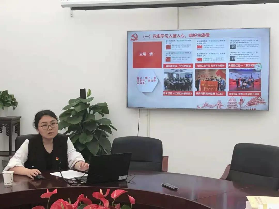 戏剧系党总支专职副书记许瑛以“多措并举,奏响党史学习教育‘大合唱’”为题,从党史学习入脑入心,唱好主旋律;红色教育有滋有味,唱好和声部;为民办事走心暖心,唱好合奏曲;建设发展有声有色,唱好最强音四个方面汇报了戏剧系党总支党史学习教育开展情况。戏剧系在党史学习教育中围绕“三立足三结合三服务三建设”,公众号陆续推出“党史上的今天”“诵百首诗词,守红色根脉”“寻访红色印记,传承革命精神”“浙艺云剧场”等专栏;成立红色轻骑宣讲团,覆盖党员、入党积极分子、青年学生,通过各类不同形式的宣讲加深对党史的领悟,教师党员带头参加“守好红色根脉,书写青春忠诚”省文旅青年宣讲团活动、团省委青年宣讲活动;开展戏剧系“永恒的红色”系列活动,首届浙江文化艺术发展基金项目原创话剧《清溪谣》建组并开排;创排《信仰的力量——陈望道的故事》《黎明前的诀别》等节目参加浙江英烈故事宣讲活动,戏剧系师生用艺术语言讲述初心与使命;开展“红色寻根,我在红巷学党史”、“雷锋精神我传承,志愿服务”,农村文化礼堂演出等沉浸式党史教育活动。