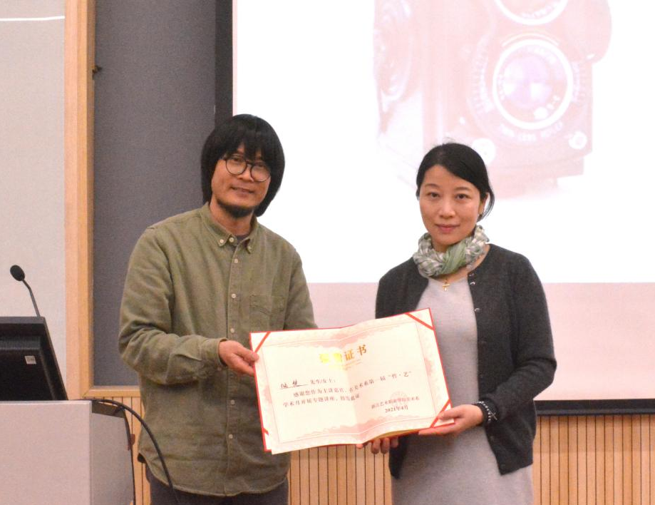 美术系常务副主任李昌国主持讲座并为储楚颁发荣誉证书。