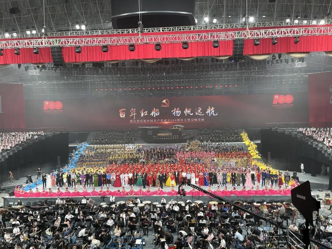 由中共浙江省委宣传部、浙江省文化和旅游厅、浙江广电集团主办的浙江省庆祝中国共产党成立100周年文艺演出大型交响诗画《百年红船 扬帆远航》于6月27日晚在黄龙体育中心震撼上演。浙艺戏剧系副主任(主持工作)那刚担任戏剧编导,2020级戏剧影视表演、表演艺术专业共65名学生参演《西江月·井冈山》《桃花谣》等节目。