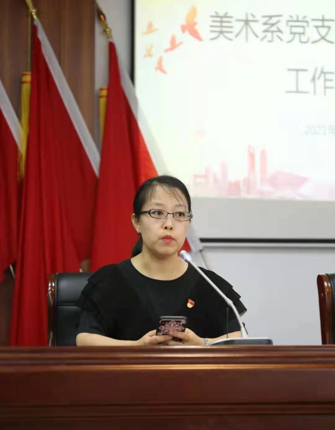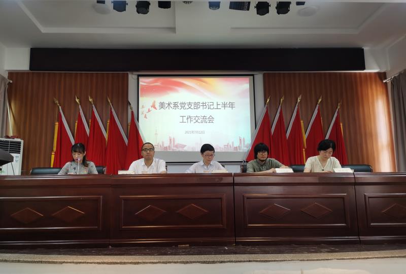 在纪念馆会议室内,美术系党总支还开展了上半年党史学习教育工作交流会,会议由美术系党总支副书记顾才铭主持。美术系党总支书记汪琳就上半年党史学习教育情况进行了总结并作了下半年工作部署。