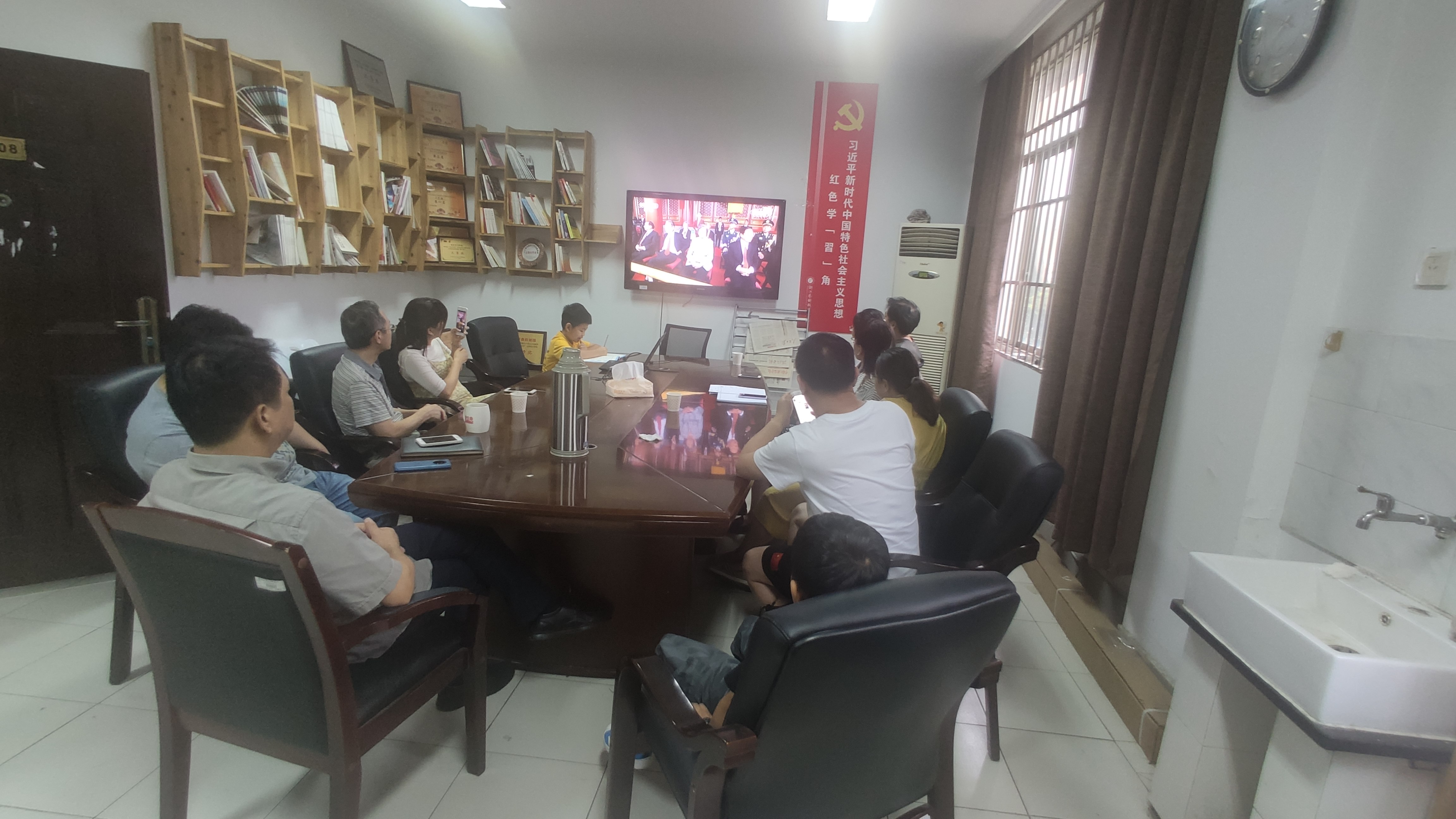 8点整,教职工们准时聚集在1108会议室,观看激动人心的历史时刻,另有工作安排的食堂师傅们、车队师傅们和值班医生们也在他们的岗位上用手机收看了此次直播。