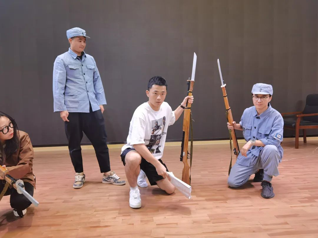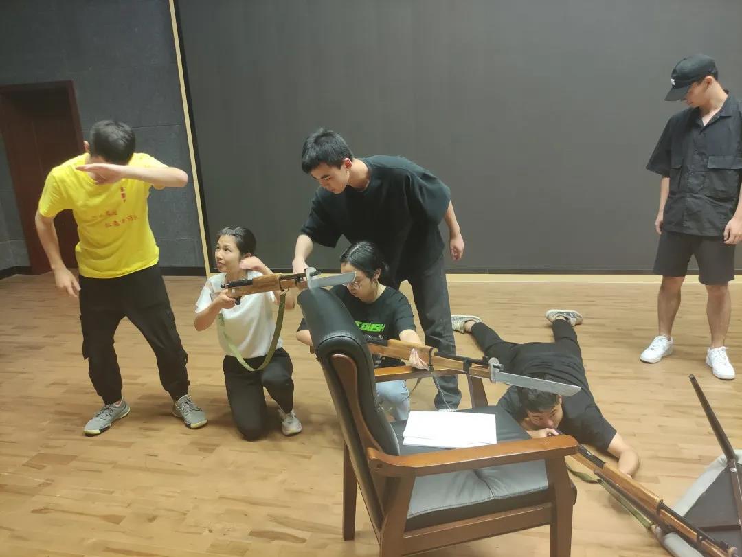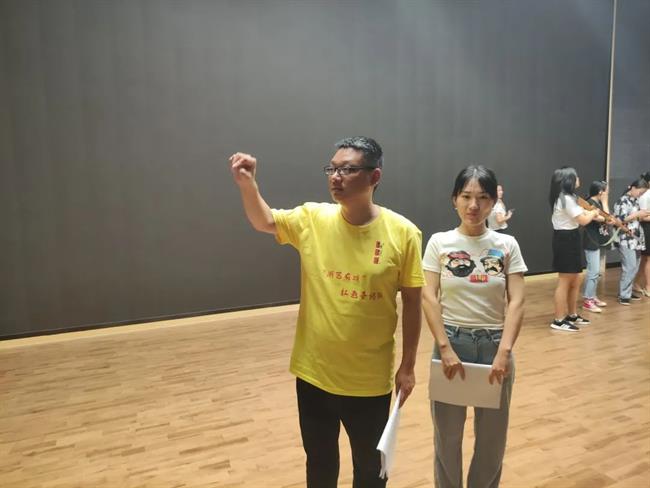 8月5日至6日,戏剧系实践团队师生为横坎头村原创红色话剧《我的山村别样红》进行指导排练。此剧组的演员全是横坎头新农村开发有限公司的职员,从未接触过话剧表演,齐帅为他们上了一堂生动有趣的“表演训练课”,通过几个小活动,让他们进一步解放天性,初步了解表演,建立舞台信念,为后续排练做好准备。短短的两天时间里,实践团队师生分工协作,从早上一直排练到晚上,虽然有时一个动作要指导好多遍,但大家都乐在其中,师生们和演员们打成一片。最终完成了《我的山村别样红》第一、二、三幕的排练。