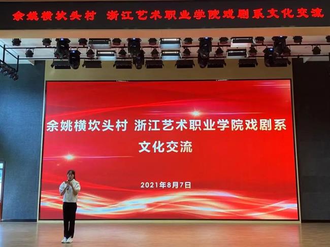 8月7日上午,在横坎头村红村剧院举行浙江艺术职业学院戏剧系与横坎头村文化交流活动,横坎头村村委领导班子、戏剧系师生参加活动。戏剧系邹易的歌曲《给电影人的情书》拉开文化交流活动的序幕,成浩杰、叶珂吟、阮佳滢同诗朗诵《青春中国》,真挚的情感讴歌革命先烈,表达对于祖国的美好祝愿。由余姚市横坎头新农村开发有限公司带来原创红色话剧《我的山村别样红》第二幕、第三幕展示,从未接触过表演、没有任何舞台经验的他们,经过短短两天的排练,有了很大的蜕变,给予现场观众诸多的惊喜。横坎头村党委书记黄科威对全体演职人员在时间紧、任务重的情况下,仍能高质量完成演出表示慰问,对戏剧系师生辛勤指导表达感谢。演员们对师生在表演上的专业性表示赞叹,其中一位演员说到,浙艺的同学们可谓是秒入戏,佩服,希望多给村里带去演出,多到村里进行艺术指导。