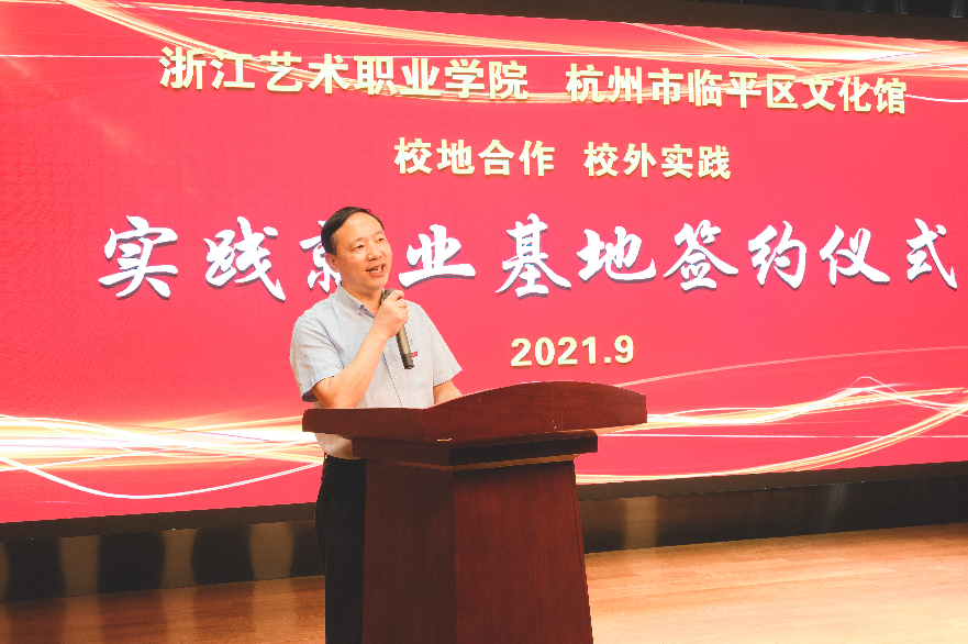 夏开堂代表学校对临平区文化和广电旅游体育局、临平区文化馆表示诚挚的感谢。他表示,深化产教融合、校企合作是现代职业教育发展新趋势,我校作为“双高”专业群建设学校,十分重视多元一体、互惠共赢的资源共享机制和产教融合平台建设。多年来,临平区文化馆与我校保持紧密合作,戏剧系累计有30余名毕业生在馆里工作,成为业务骨干和中坚力量。此次,开展校外实践就业基地合作,共同搭建信息互通、文化互动、资源互补和人才供需常态化对接平台,必将促进更广领域、更宽平台、更深层面的交流合作,达成学校与临平区文化馆的合作“双赢”。