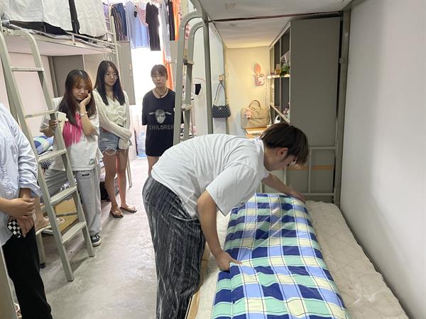 从地面卫生、床铺整理、桌面摆放,教官们耐心讲解,亲身示范,让新生们对寝室内务标准有了更清晰的认知。胡墨智力强调寝室违规违纪,她提醒新生要遵守公寓规章制度,不使用大功率电器、不私拉电线,共同守护寝室这个小家。新生们认真听,用心学,很快掌握了整理宿舍内务技巧,快速整理了起来。