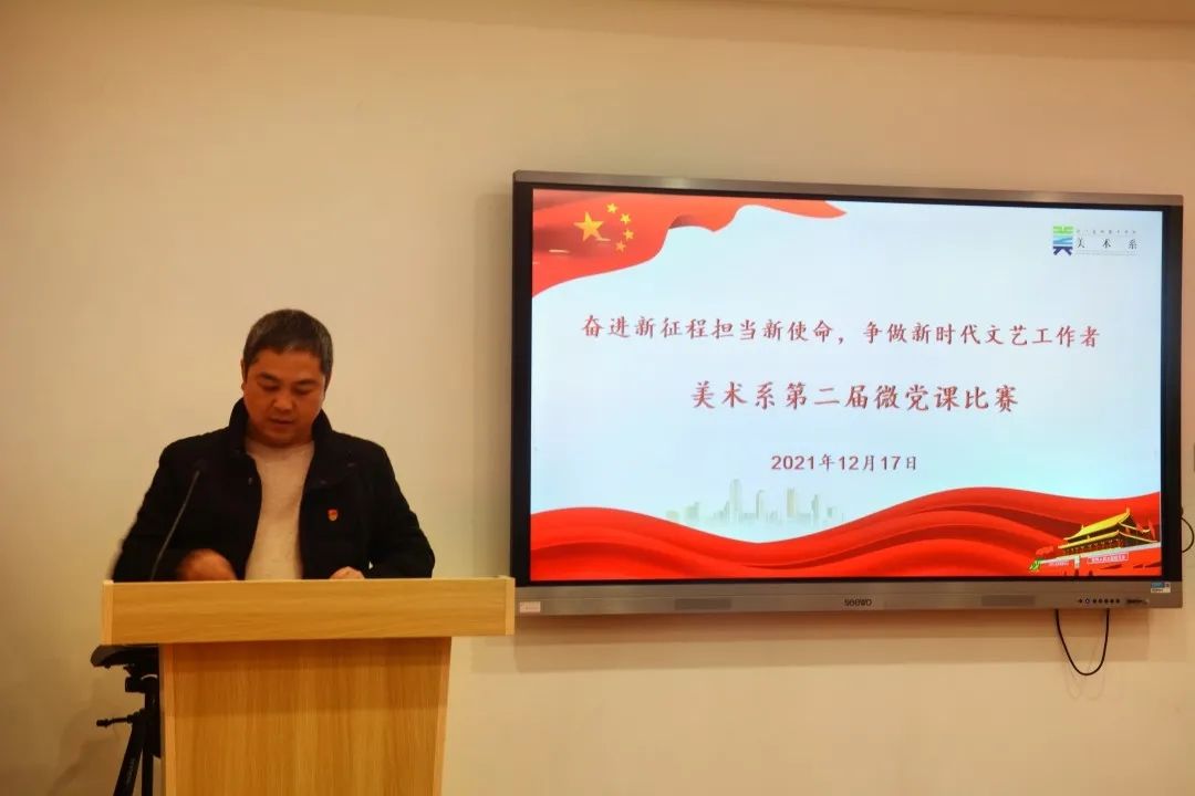 12月17日,美术系学生党支部开展“奋进新征程担当新使命 争做新时代文艺工作者”第二届主题微党课比赛。此前,来自第38期党校学员的10名同学,经过系部初赛选拔后,共有5名同学脱颖而出参加本次微党课决赛。美术系组织员章彪、学生党支部书记龚林峰、团总支副书记朱丹丹出席并担任比赛评委。全体学生党员、入党积极分子代表、青年理论学习小组成员代表等现场观摩学习。