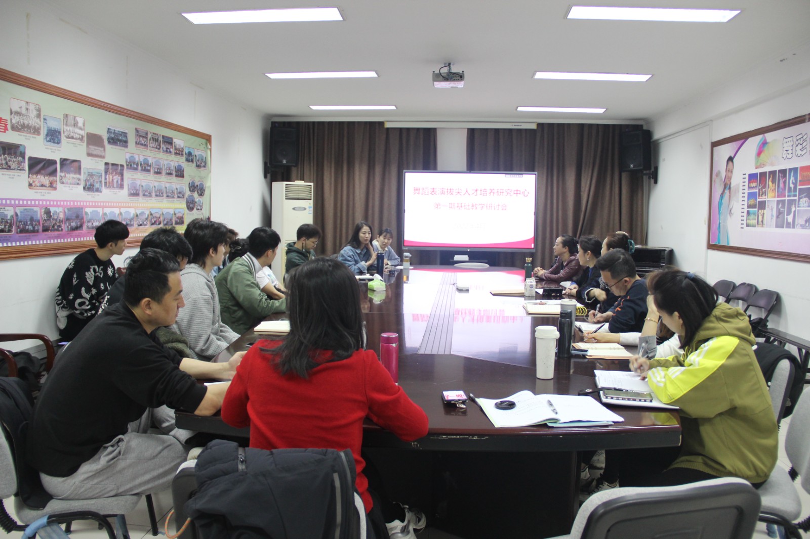 挂牌仪式后,全体教师召开了第一期基础教学研讨会,老师们围绕着舞蹈基础教学的教学方法、教学重点、教学难点、存在问题等方面深入开展了交流讨论。
