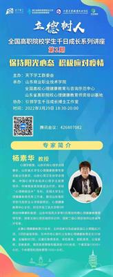 为进一步加强疫情防控期间学生的心理健康教育,缓解学生疫情下学习、生活的心理压力,以更加积极的心态面对疫情。文教学院组织全体学生以寝室为单位同上一堂课,共同观看了由杨素华教授带来的云讲座《保持阳光心态,积极面对疫情》。同学们获益匪浅,学习成效显著,学会了如何在常态化疫情防控环境中,保持阳光乐观的心态,积极抗疫。