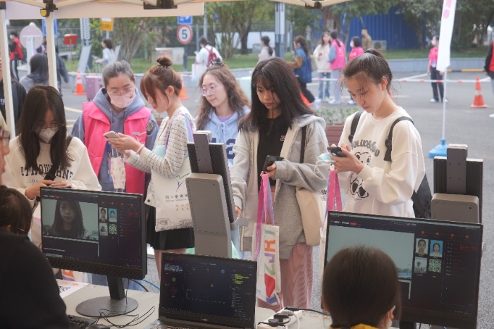 新生们手持各式KT板在背景板前打卡留念,在背景板上寻找自己的面孔,在“学生证”前留下入校的第一张照片。