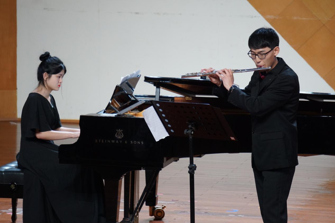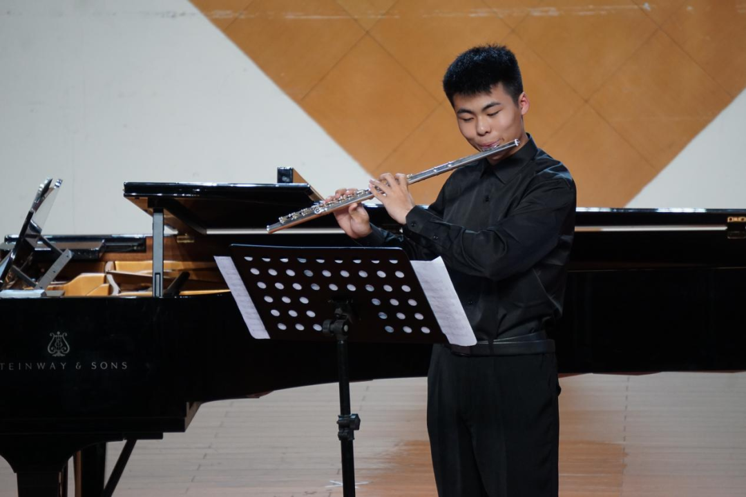 22级新生万宏屹是学院第一位三年制中专学长笛的学生,他与19键盘一贯班的郑好配合演奏的《D大调长笛协奏曲》是莫扎特很有代表性的作品,对技巧、气息、节奏都需要有较好的把控。