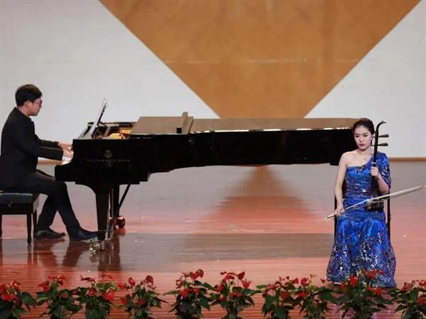 《雪山魂塑》由附中二胡青年教师蒋陈竹与艺术指导熊壮壮老师合作完成,现场收获一片赞誉。此曲是刘文金晚年为纪念红军长征胜利70周年而作的二胡协奏曲。蒋陈竹的二胡演奏时而委婉、时而铿锵、音乐如泣如诉、动人心弦。