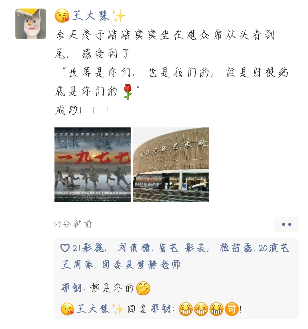 话剧《1977》在电影《高考1977》的基础上,加了一条知青后代返乡支教的“线”,两个时空平行叙述,使我多了一份对那段岁月的回望和感慨。剧中的知青岁月,是父母辈的青春。我现在越来越理解他们在我小时候,嘱咐我好好读书时的那份殷切。每个时代都会有相同的境遇,人作为个体,在势不可挡的政治、经济、军事、疫情这样的大环境中,始终是渺小的,但仍然可以选择坚强,正如话剧《1977》里的他们,无力反抗时积蓄力量,在机遇来临时豁出去拼搏一把,去改写自己的命运。
