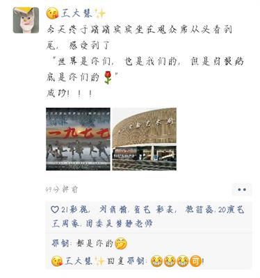此次,我以摄影的身份观看了话剧《1977》。大幕打开,一片参天而立的白桦林映入眼帘,稻草垛、瞭望塔、黑板报、大麻包,瞬间将观众带到了那个年代的北大荒。知青在那段岁月里成长,黑土地因为他们而更加肥沃,他们面对人生的选择和将来的道路思考着,并怀揣着希望,以坚韧不屈的精神呼唤未来。除了有关高考的故事之外,话剧《1977》里也有这一段感人肺腑的“北大荒之恋”,与电影《山楂树之恋》的故事有些相似。只是在舞台之上的人物更加真实,也更能打动人心。话剧《1977》为了更好地体现时代面貌,甚至把当年的解放牌拖拉机都搬上了话剧舞台,无论是白桦林、黑土地、土布挎包青布衣,还是大喇叭、小茶缸、七宝大曲拖拉机,都让人仿佛置身于此情此景。在叙事方式上,导演采用了意识流的表现手法和情节线的双向设置,舞台调度干净利落、叙事清楚,在感动我们的同时,也给我们留下了广阔的思考空间。对于观众而言,每一次观摩都是一次旅行。人生因艺术而精彩,生活因艺术而丰富,愿艺术之花香满校园!